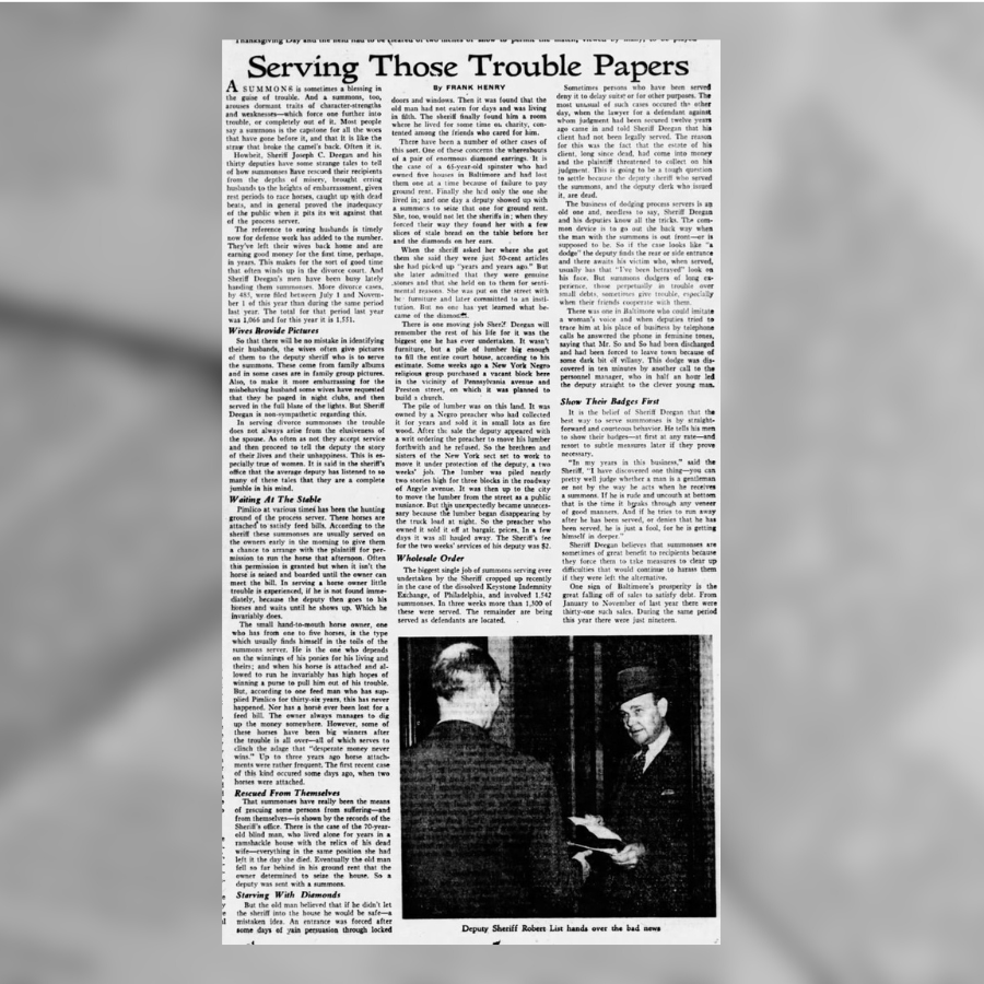The authority granted to the Sheriff of Baltimore City comes from common law—created by a Constitutional amendment passed in 1844 [Laws of 1842, Chap. 246; confirmed by Laws of 1843, Chap. 184]. As an independent and elected office, the Sheriff of Baltimore City is directly accountable to the citizens of Baltimore. Upon being elected in 2022, Sheriff Sam Cogen became Baltimore City’s 41st Sheriff.